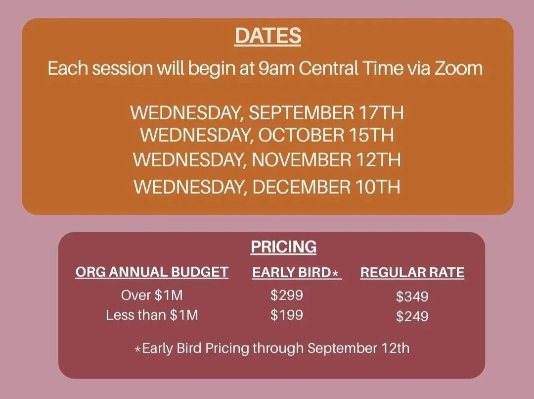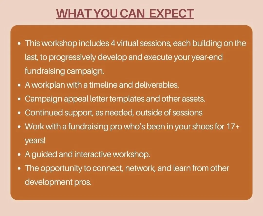 In session, we will: Identify the fundamentals to get started (vision, message, budget, key collaborators, etc.), review the importance of a year-end campaign, finalize your outline and workplan, and execute your plan with manageable next steps. The first session will be 90 minutes with the remaining three at 60 minutes.